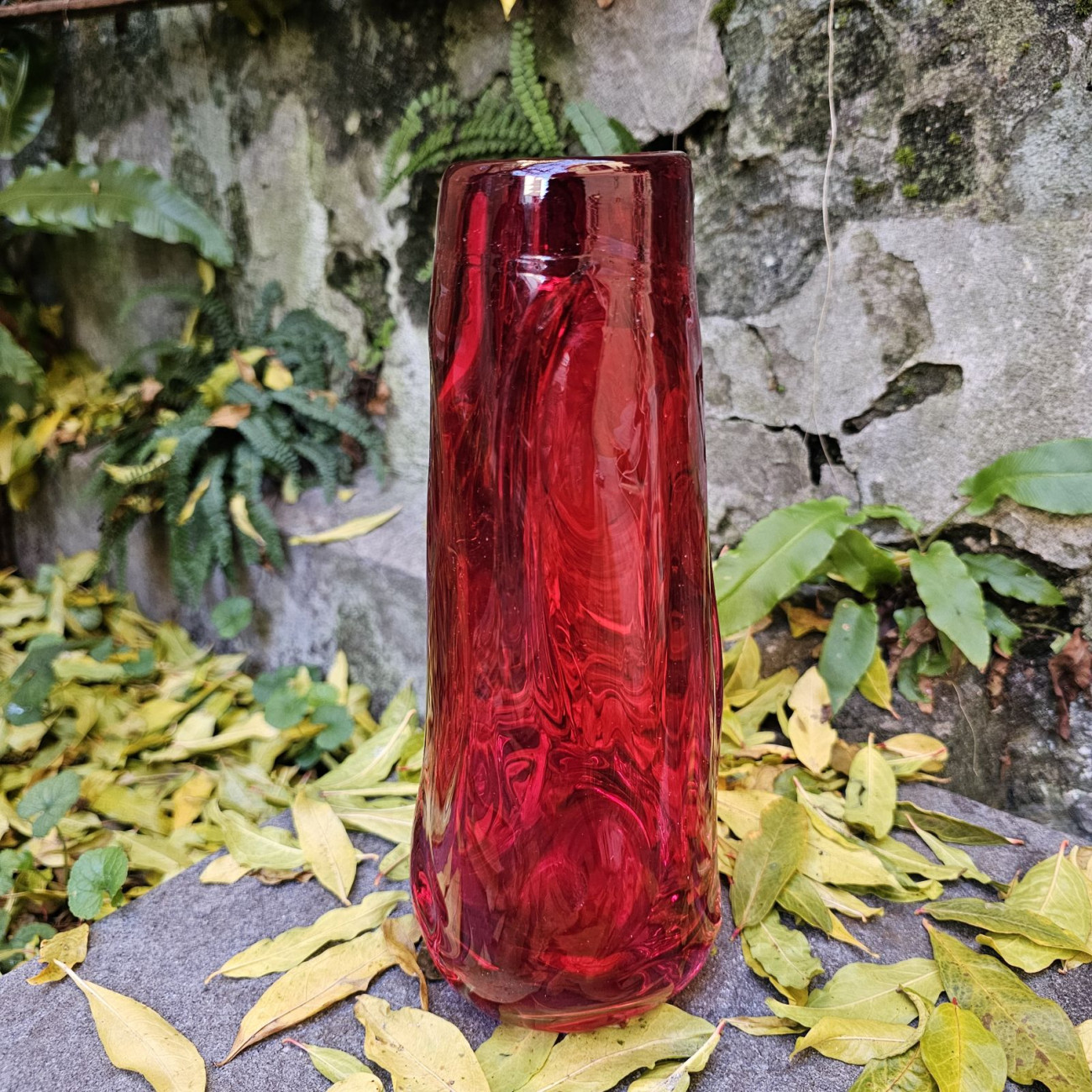 Elegante vaso in vetro soffiato inglese color rosso rubino, prodotto negli anni ’60 dalla celebre manifattura Whitefriars, una delle realtà più importanti del vetro artistico britannico del Novecento.