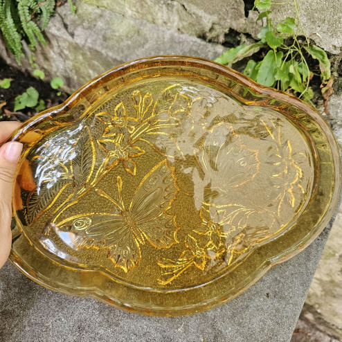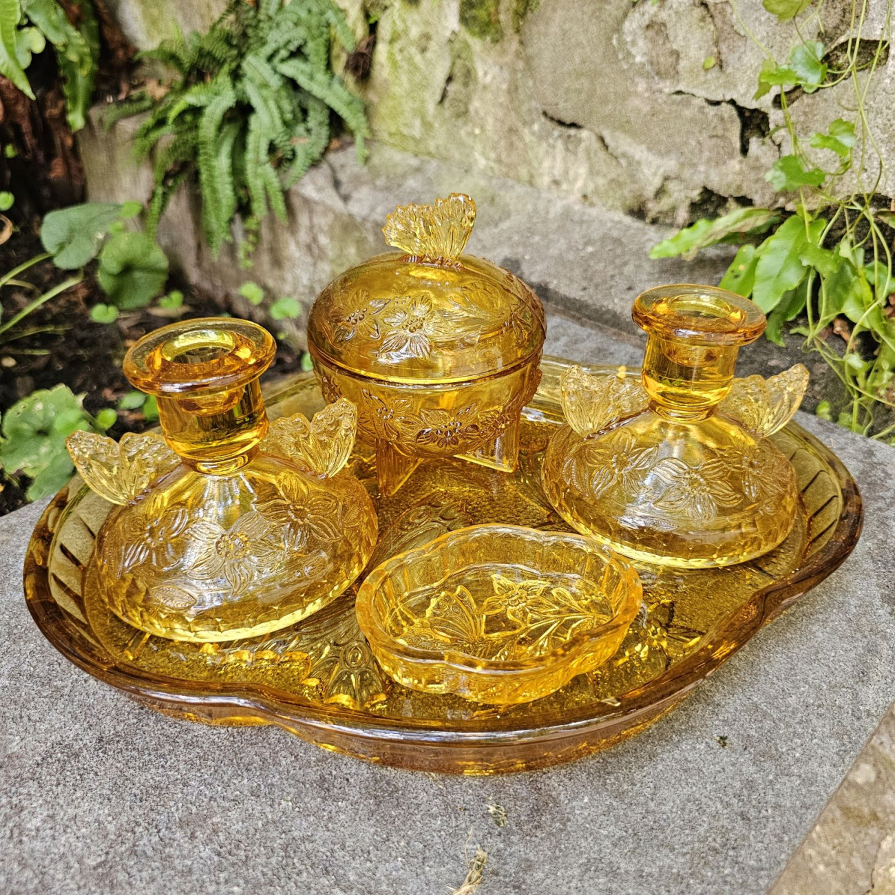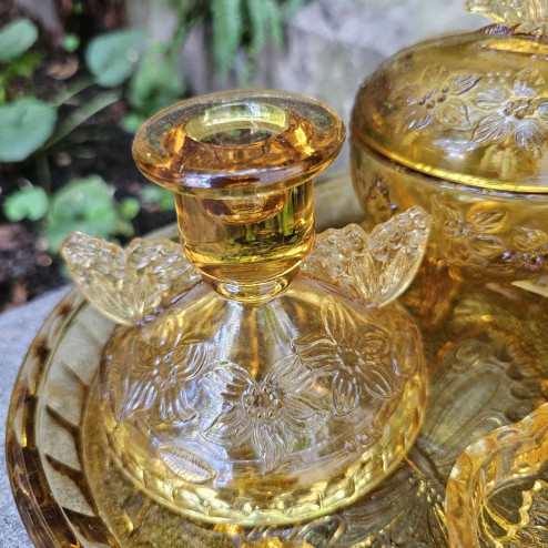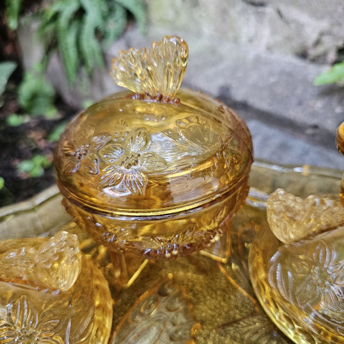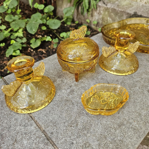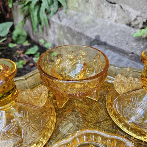 Raro set da toilette inglese in vetro pressato color ambra degli anni ’30, modello “Butterfly” di Sowerby. Composto da vassoio, due piccoli candelieri, coppetta e portacipria con coperchio, tutti decorati con eleganti farfalle.