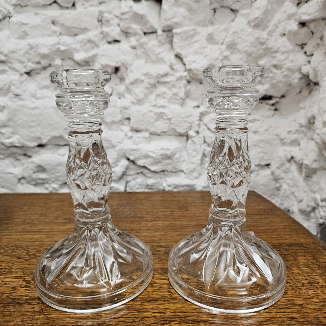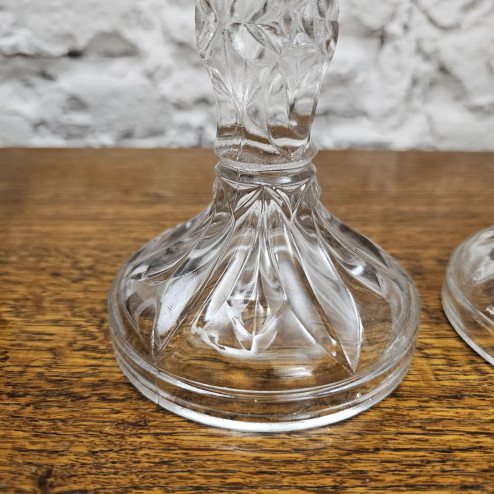 Elegante coppia di candelieri inglesi in vetro pressato, realizzati con un disegno ricco di dettagli geometrici e giochi di luce tipici della produzione britannica del primo Novecento.