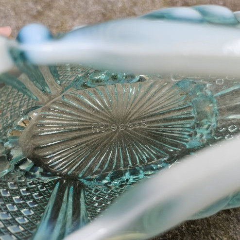 Piccolo cestino inglese in vetro pressato Blue Pearline prodotto dalla vetreria Davidson. Il vetro azzurro sfuma ai bordi in un delicato opalino quasi bianco. Marchiato con numero di registro del 31 marzo 1888. Perfette condizioni. Dimensioni 20 x 14 cm, altezza 12 cm.