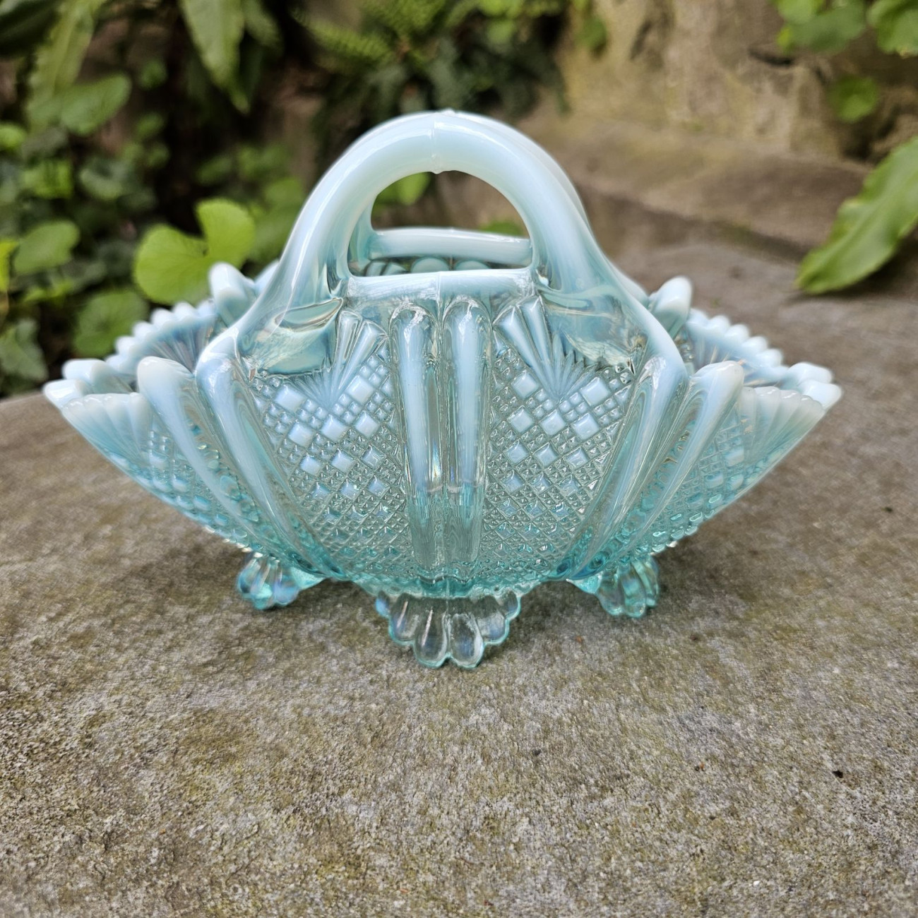 Elegante cestino in vetro pressato Blue Pearline prodotto dalla manifattura inglese George Davidson & Co. alla fine dell’Ottocento.