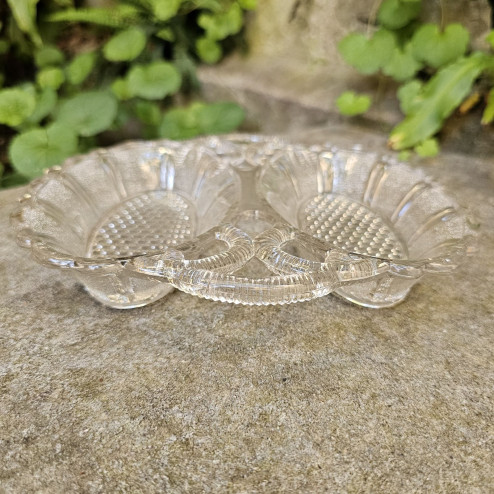 Coppetta in vetro pressato inglese a forma di foglia, prodotta in inghilterra negli anni 30.