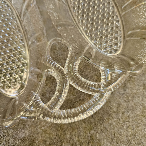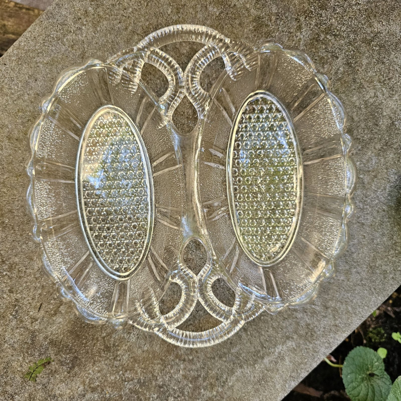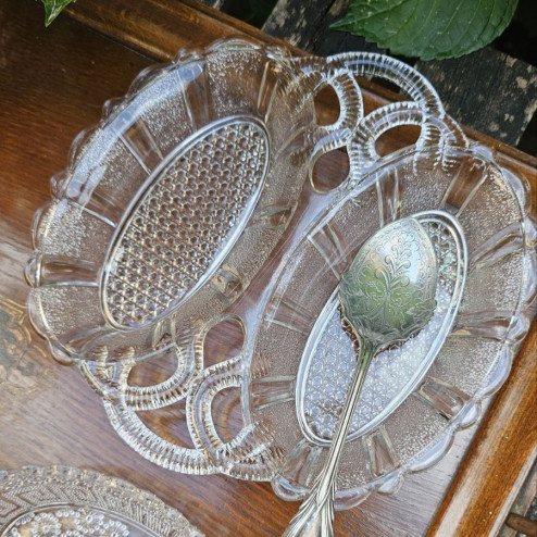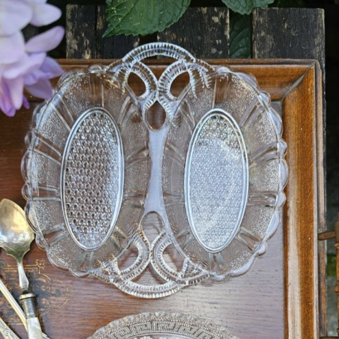 Piatto in vetro pressato vittoriano, prodotto dalla famosa vetreria Davidson.