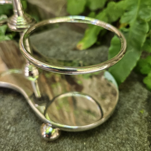 Le condizioni sono buone: il vetro è integro e ben conservato, mentre lo stand presenta alcune leggere scoloriture della placcatura, normali per oggetti di questo tipo e periodo, che non ne compromettono l’uso ma testimoniano la sua storia.