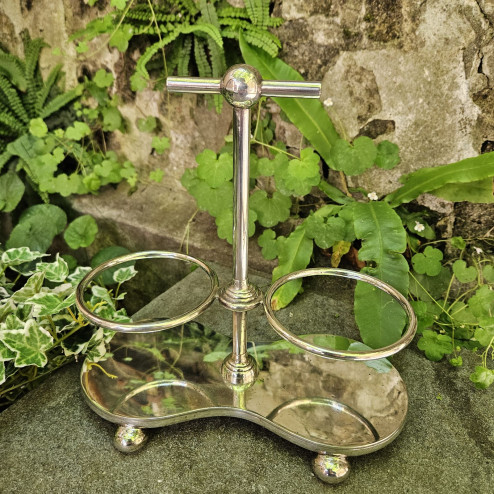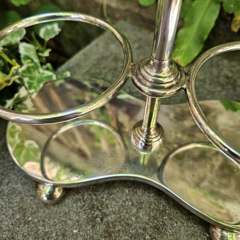 Lo stand ha una struttura slanciata e ben proporzionata, con base sagomata poggiante su piedini sferici e un manico centrale che rende l’oggetto pratico oltre che decorativo. I due anelli laterali accolgono i vasetti, permettendo di portarli a tavola con facilità, secondo una tipologia molto diffusa nella cultura inglese, pensata per servire sottaceti, conserve o piccoli accompagnamenti.