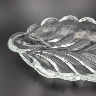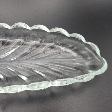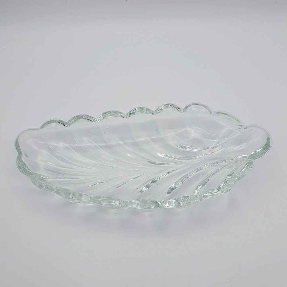 Coppetta in vetro pressato inglese a forma di foglia, prodotta in inghilterra negli anni 30.