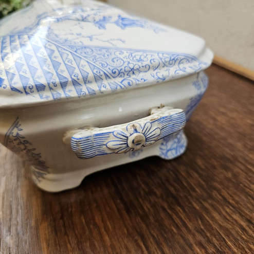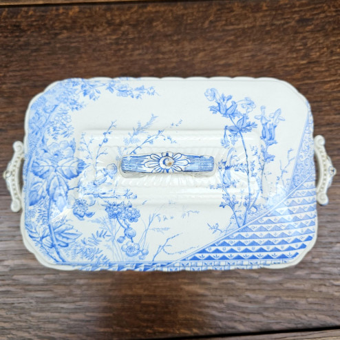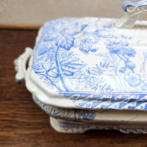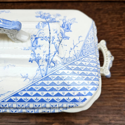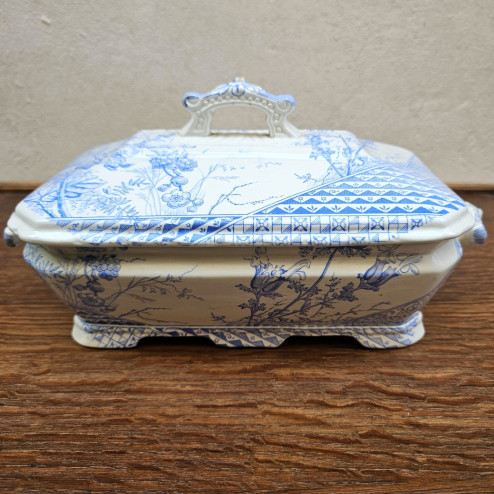 Legumiera in ceramica inglese ironstone prodotta da John Meir & Son intorno al 1880, decorata con il raffinato motivo GEM in blu. Un elegante esempio di Aesthetic Movement, completa di coperchio e manici laterali.