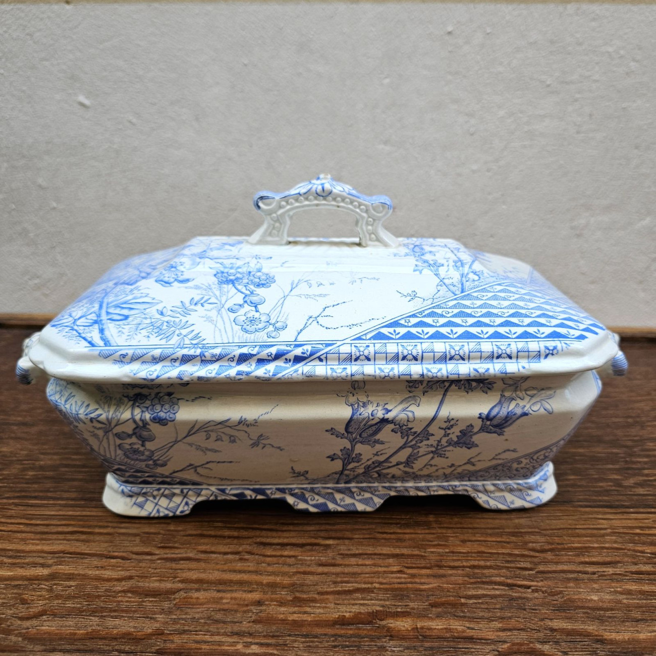 Il decoro, realizzato in transferware blu, combina motivi floreali naturalistici con elementi geometrici e bordure ornamentali di gusto orientaleggiante, pienamente riconducibili all’estetica dell’Aesthetic Movement, corrente artistica che influenzò profondamente le arti decorative inglesi della seconda metà dell’Ottocento.